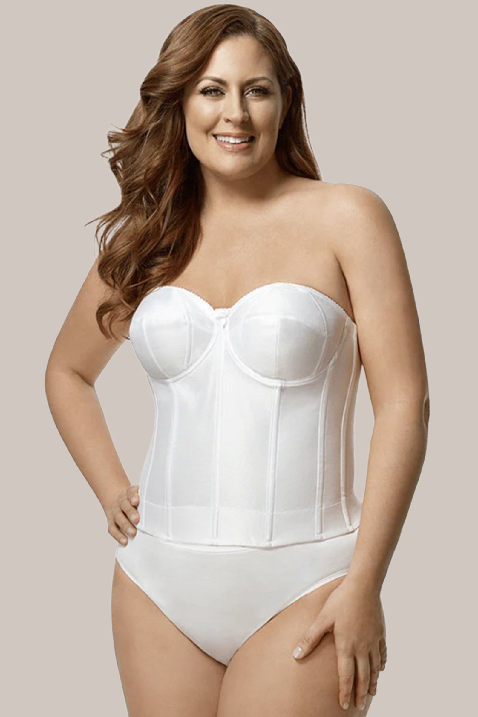 Designed for elegance and engineered for confidence, this smooth strapless longline corselet offers firm support and full coverage beneath any special-occasion look. Its three-piece simplex cups lift and define, while light boning through the body and cups shapes the waist and enhances posture. A high-power back ensures secure hold and a sleek, seamless finish under gowns or fitted attire.